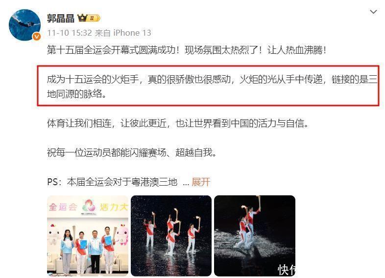 郭晶晶自己也在社交平台发了条动态,没说什么豪言壮语,就一句:“能成为十五运会的火炬手,既骄傲又感动。”她说,火炬传递的不只是火焰,还有三地同源的情谊。体育让人靠近,也让世界看到中国的底气。网友看得眼热,直呼“又美又飒”“这才是真正的国民女神”。